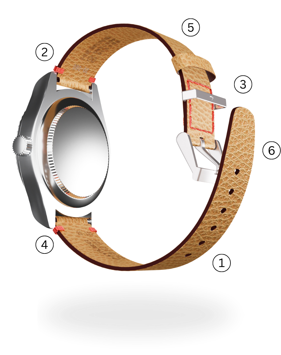 Customize your watch strap to perfectly match your watch and wrist by selecting leather, stitching, exact strap width, and length. Each strap is made to order for a tailored fit and timeless style. See the strap sizing guide here.